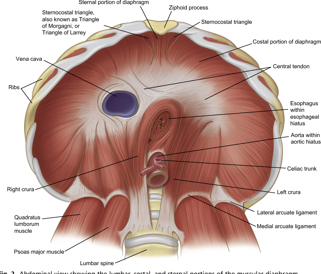 The diaphragm influences the upper torso as it attaches to the inner aspect of the lower six ribs, the back of the sternum and the xiphoid process. Like a parachute, it wraps around the liver, stomach, spleen and pancreas. The esophagus and the abdominal aorta travel through the diaphragm, see photo of diaphragm, you will see two holes at the top. Fluctuating pressure created from breathing then influences blood flow, particularly blood flow back to the heart. From dailybandha.com, The pericardium, which is a sac surrounding the heart, has fascial connections to the diaphragm. Accordingly, the heart does move during breathing.
